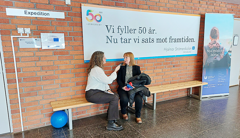 Som avslutning på samvaron i caféet och som symbolisk avslutning på jubileumsåret rullade Emilia Nilsson, student 2016, ner den fina roll-up som prytt skolans entré sedan jubileumsåret startade för bra precis ett år sedan. Emilia var först ut av de 15 före detta elever som presenterats på Hjalmar Strömerskolans webbplats under jubileumsåret. Där kan man också läsa om till exempel historierna bakom Skridskogymnasiet och Skyttegymnasiet, skolbranden 1987, rockkonserterna i sporthallen på 1970-talet och framtidsspaningar av olika slag.